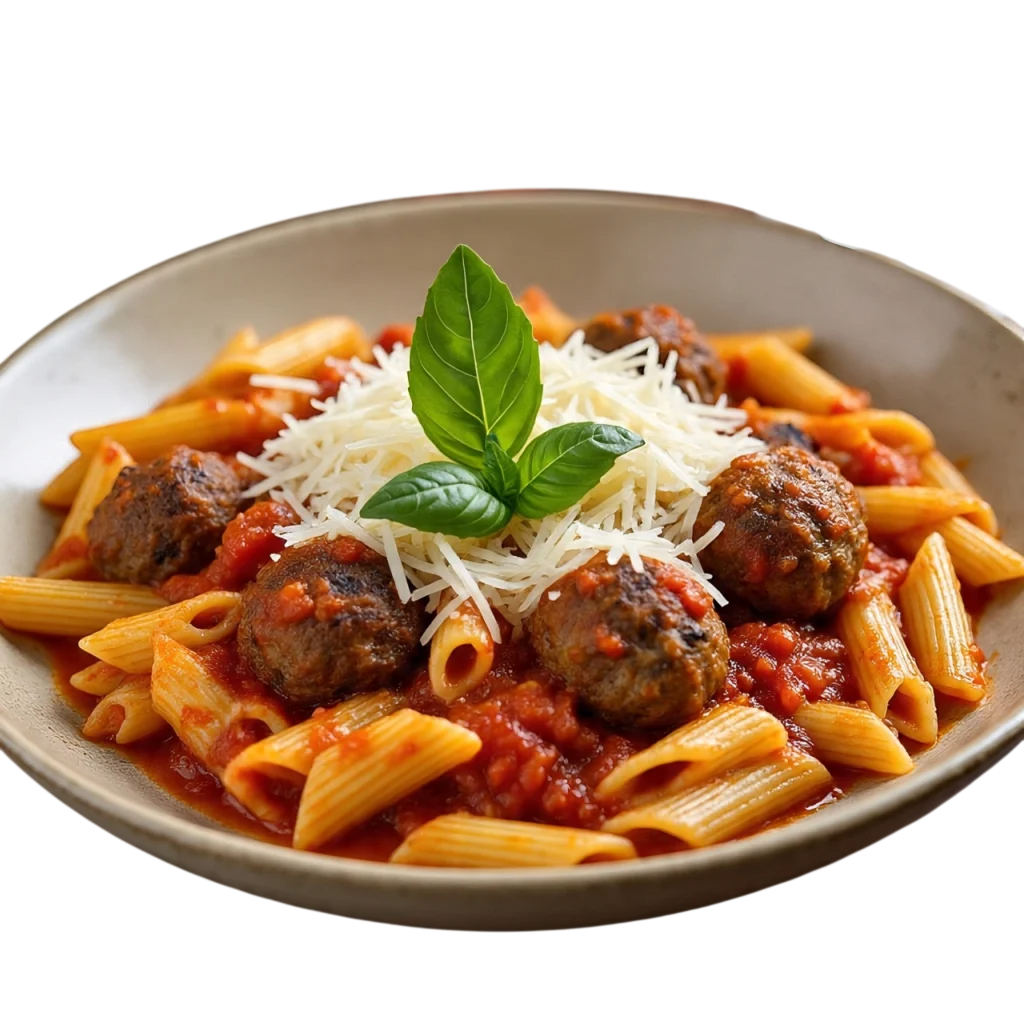 The Penne & Meatballs Pasta features perfectly cooked penne pasta tossed in a flavorful tomato sauce and topped with tender, seasoned meatballs. Finished with shredded cheese and herbs, each bite delivers a comforting blend of savory flavors and satisfying textures. The combination of hearty pasta and juicy meatballs makes this dish a timeless favorite.